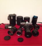 Minolta SR-T 101 snabb, enkel, fin, bra kvalitet. Jätte bra Kamera med 5 objektiv, allt kostar 2800kr.