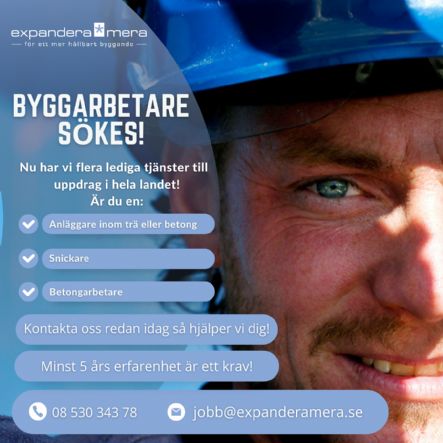 Наши требования к соискателям: 1. Разрешение на работу в Швеции. 2. Опыт и знание своей профессии. Мы предлагаем: 1. Рабочие условия согласно профсоюзу Byggnads. 2. Работа по место жительства или по всей Швеции(в таком случае оплачивается жильё/дорога/командировочные Резюме можно отправить на jobb@expanderamera.se, если резюме нет то убедитесь что в вашей заявке есть следующая информация: 1. Имя и возраст 2. Желаемая вакансия 3. Контактные данные (телефонный номер/электронная почта) 4. Опыт работы по специальности(Страна, период) По вопросам можно обращаться по номеру: +46707703272