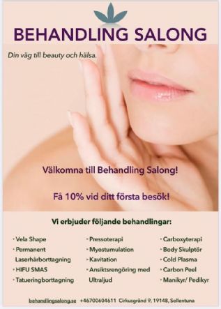 Аппаратный массаж, лазерное удаление волос и многое другое: - VelaShape (вакуумнороликовый массаж RF для лица и тела) - Прессотерапия - Кавитация - Миостимуляция (бодискульптр) - HIFU smas лифтинг Процедуры для ухода за лицом: - Радиолифтинг (RF) - Микротоки - Ультрозвуковая чистка лица - Карбокситерапия (не инвазивная) - Альгинатная маска - Карбоновый лазерный пилинг Лазерные процедуры: - Удаление волос перманент - Удаление и татуировок и перманентного макияжа - Удаление сосудистых заездочек - Удаление пигментных пятен Удаления папилом коагулятором или лазером Cold plasma ( плазменный лифтинг лица рук тела) А также вы можете использовать Friskvårdsbidrag К вашим услугам в нашем салоне высококачественные услуги мастера маникюра Вероника 0761911201 Работаем по записи в удобное для вас время! Добро пожаловать к нам! Получите 10 % на первый визит к мастеру! Sollentuna. Cirkusgränd 9 . Телефон для записи 0700604611 behandlingsalong.se наша страничка с описанием всех услуг