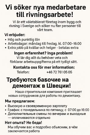 Vi är ett väletablerat företag inom bygg och rivning i Sverige och söker nu fler personer till vårt team. Vi erbjuder: • Hög och punktlig lön • Arbetsdagar: måndag till fredag, kl. 07:00–16:00 • Extra jobb på kvällar och helger – betalas extra Ingen erfarenhet? Inga problem! Vi lär dig allt du behöver veta och förklarar arbetsuppgifterna på ett tydligt sätt. Kontakta oss för mer information: Telefon: 076 591 91 40 Telegram: +46 72 761 05 05 Требуются рабочие на демонтаж в Швеции! Наша строительная компания приглашает новых сотрудников для работы по демонтажу. Мы предлагаем: • Высокую и своевременную зарплату • График: с понедельника по пятницу, с 07:00 до 16:00 • Дополнительные смены по вечерам и в выходные — оплачиваются отдельно Нет опыта? Не беда! Мы обучим вас и подробно объясним, в чём заключается работа. Связаться с нами: Телефон: 076 591 91 40 Telegram: +46 72 761 05 05
