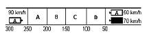 | (A) Heldragen kantlinje på rak väg. (B) Streckad kantlinje innan kurva. (C) Streckad kantlinje på rak väg. |
