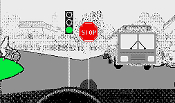 | Du kör på en gata i ett villaområde. I din närhet står två parkerade bilar. Mellan bilarna kommer en boll utrullande. Längre fram ser Du en mötande bil och en bil som backar ut från en tomt. Se bilden till höger. Vilken två situation ska Du i första hand vara uppmärksam på? |
