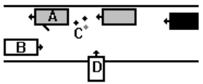 | (A) Bildörren som öppnas. (B) Den mötande bilen. (C) Barn mellan bilarna som springer efter bollen. (D) Den utbackande bilen. |