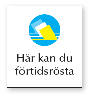 При досрочном голосовании Вы должны иметь при себе свою карточку для голосования. Этим символом обозначены те участки, где Вы можете проголосовать досрочно. Такое помещение может, например, находиться в здании муниципалитета, в школе или библиотеке. Там также будут размещены афиши с информацией о порядке голосования. За информацией о досрочном голосовании можно обратиться на сайты Центризбиркома : www.val.se или муниципальных органов. Если Вы будете голосовать не по месту жительства и хотите отдать свой индивидуальный голос за отдельного кандидата, нужно взять с собой избирательные бюллетени , чтобы таким образом проголосовать за кандидатов партии, баллотирующихся на территории Вашего муниципалитета. | ИМЕТЬ ПРИ СЕБЕ