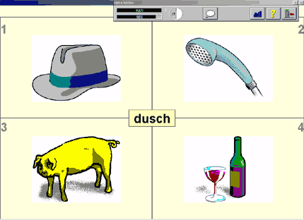 Изображение одного из уроков, где произносится слово, пишется посередине экрана, и предлагается дать ответит из 4х визуальных вариантов: