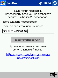 | 3. Не активированная программа имеет ограничения и позволяет сделать только 20 переводов. Процедура активизации осуществляется в программе через окошко регистрации (см. рис). Покупка серийного номера возможна на Пальма Маркете. Код придет прямо на адрес вашей электронной почты. Введите полученный номер и нажмите кнопку "Зарегистрироваться". Правильно введенный номер снимает все ограничения со словаря и позволит в будущем получить скидки на новые версии программы. | ![]() |