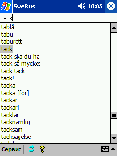 2. После запуска программы вы сразу получите возможность делать переводы со шведского и русского языков. В строке перевода введите необходимое слово, внизу отобразится список имеющихся слов в алфавитном порядке. При щелчке по нужному слову отобразится окно с его переводом.